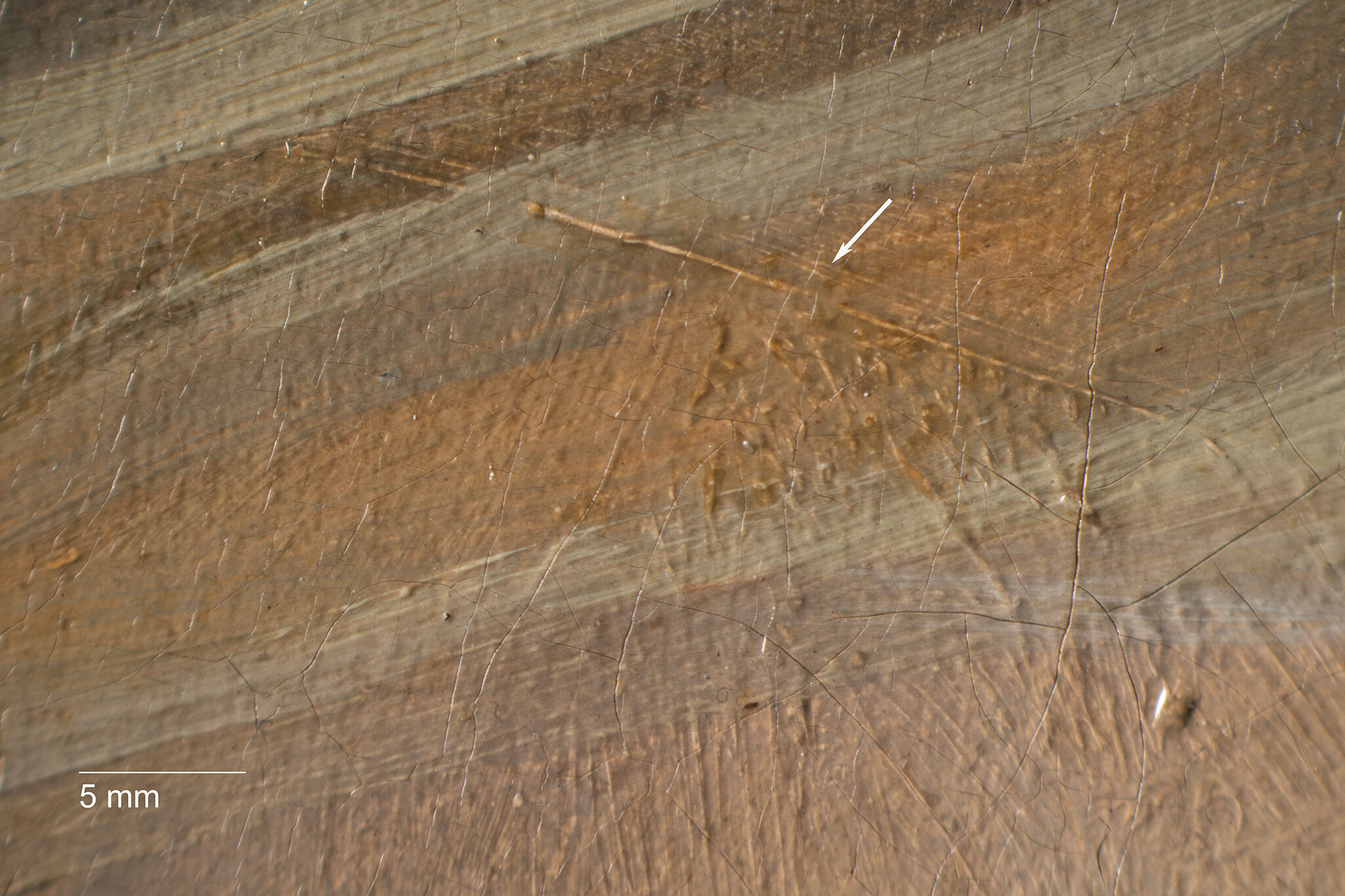 Fig. 12. Photomicrograph of a thick, underlying paint stroke that reveals the former drape of the garment at the sitter’s back, Head of a Girl (ca. 1770 or later)