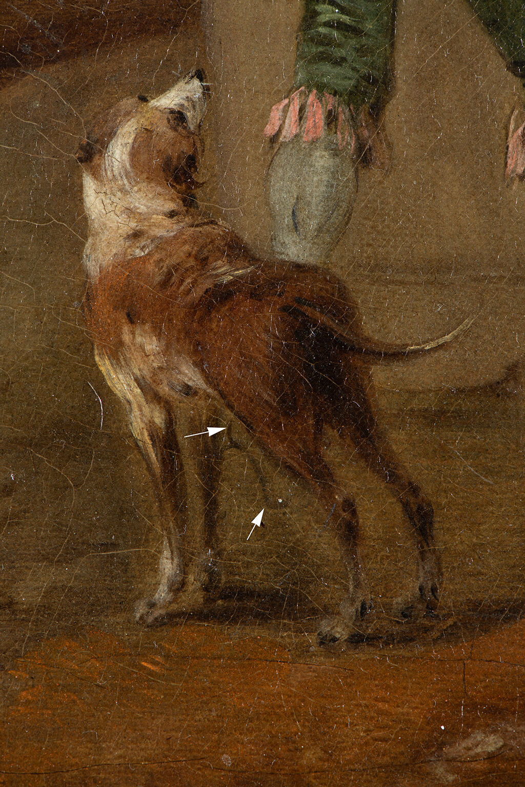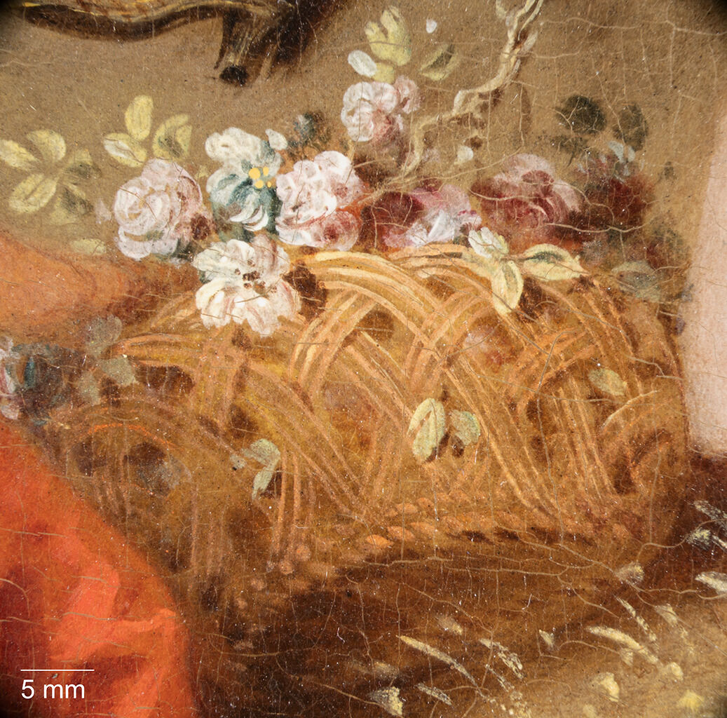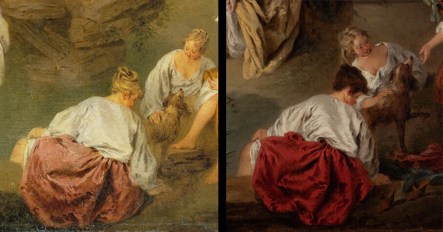 Though the garment appears to be somewhat transparent, when comparing the painting today to the image reproduced in the 1928 catalogue raisonné, it appears this restoration has increased in transparency with age. Likely, it appeared more opaque and cohesive with the figure when it was first added. Florence Ingersoll-Smouse, Jean-Baptiste Joseph Pater: Biographie et catalogue critiques, l’œuvre complète de l’artiste (Paris: Les Beaux-arts, 1928), 121.