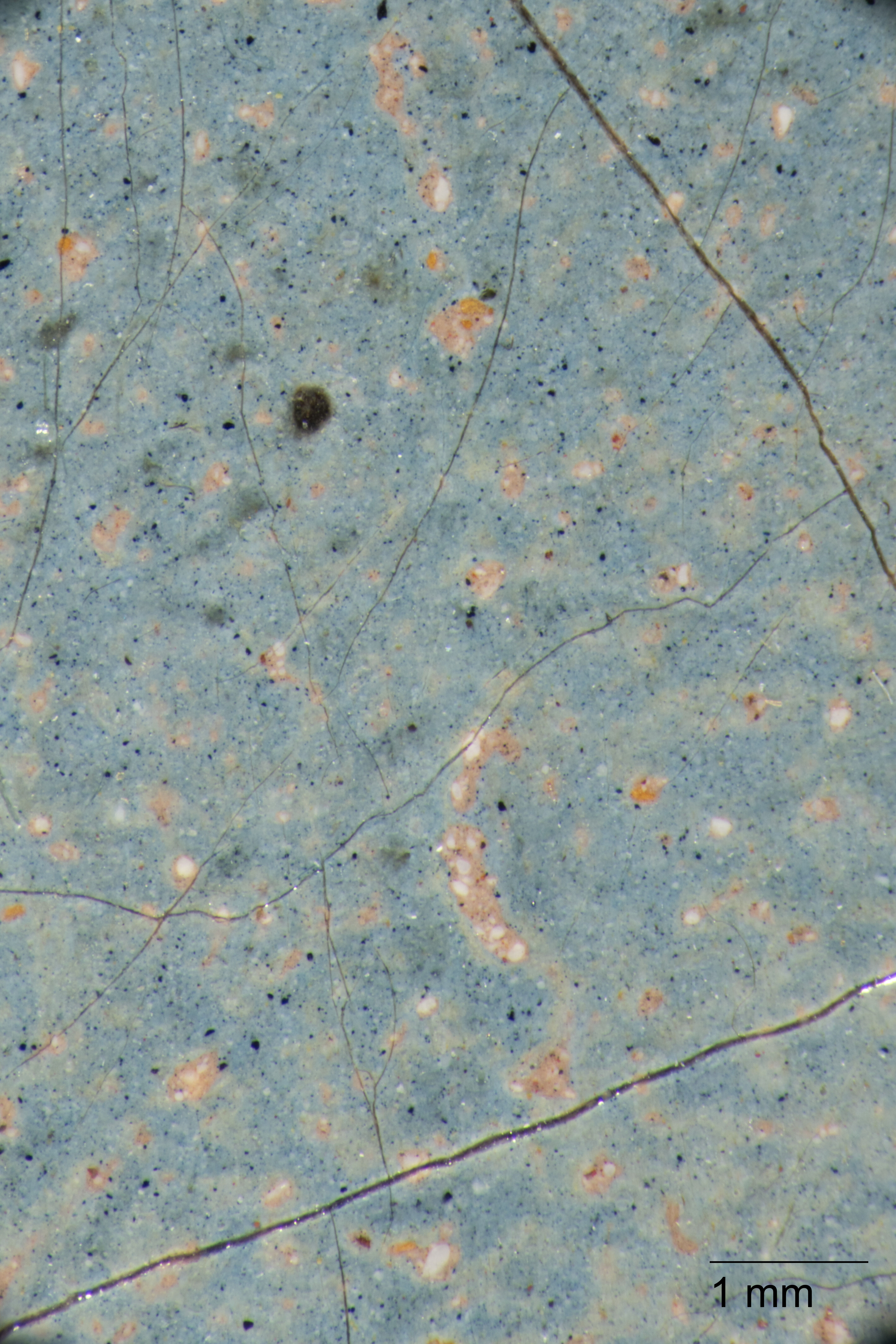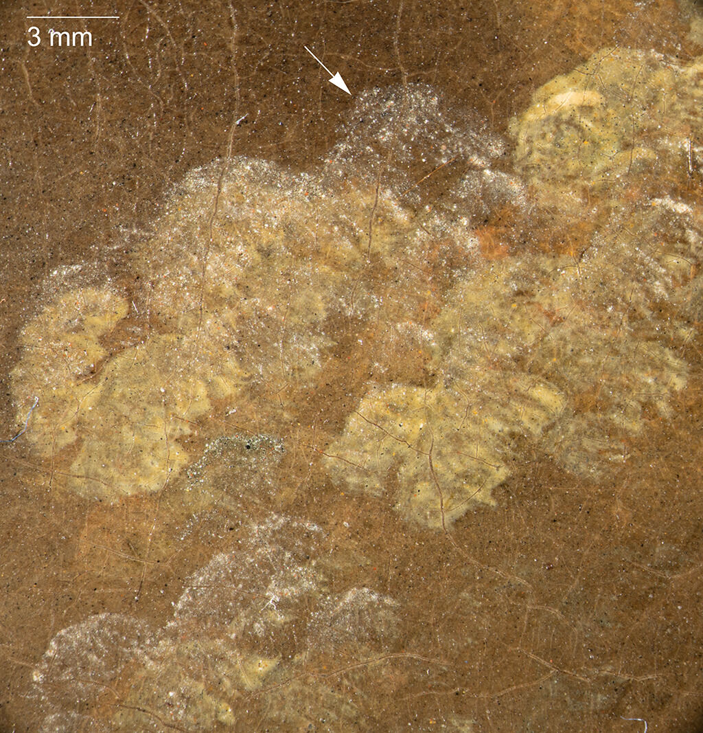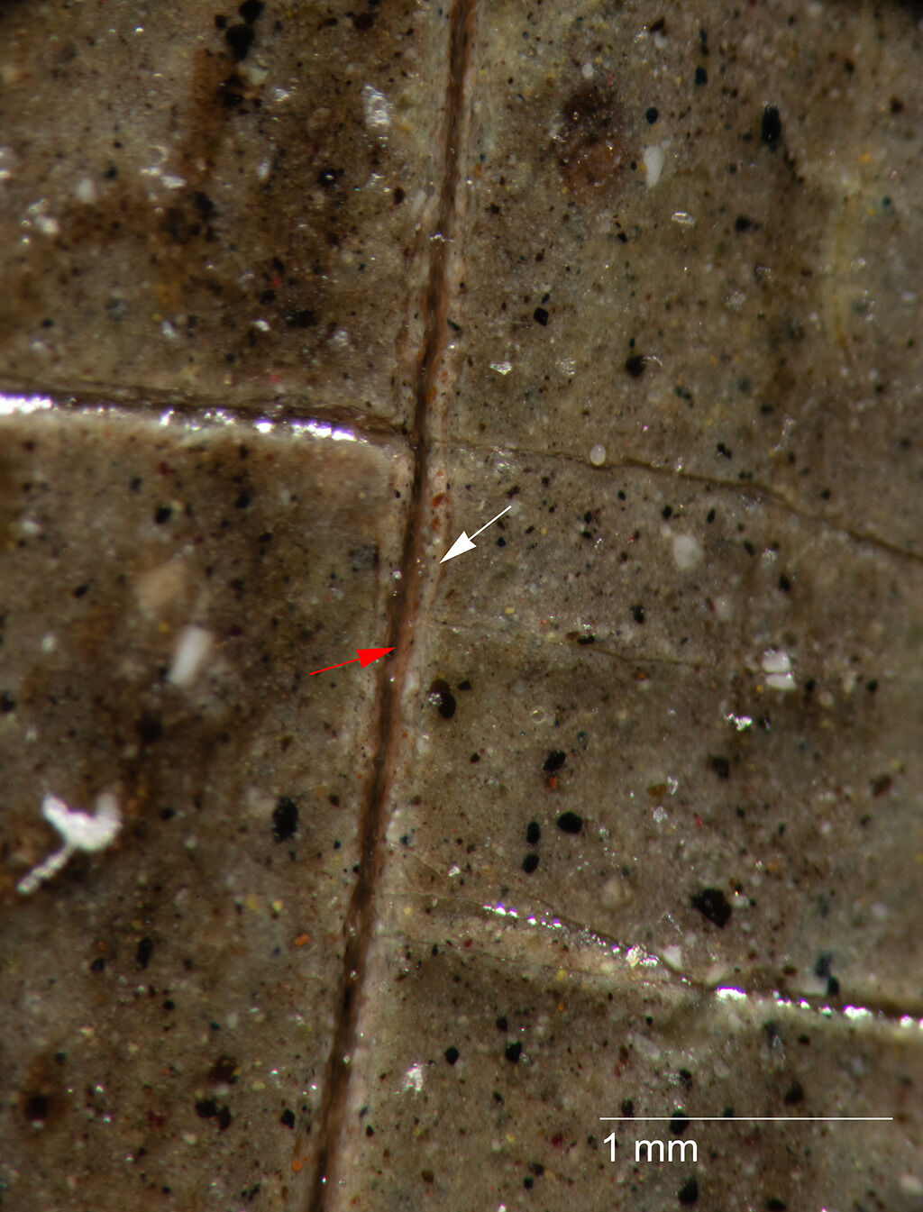 Fig. 19. Photomicrograph of the red-earth ground layer visible through abrasion in the sky, The Bathers (1728–30)