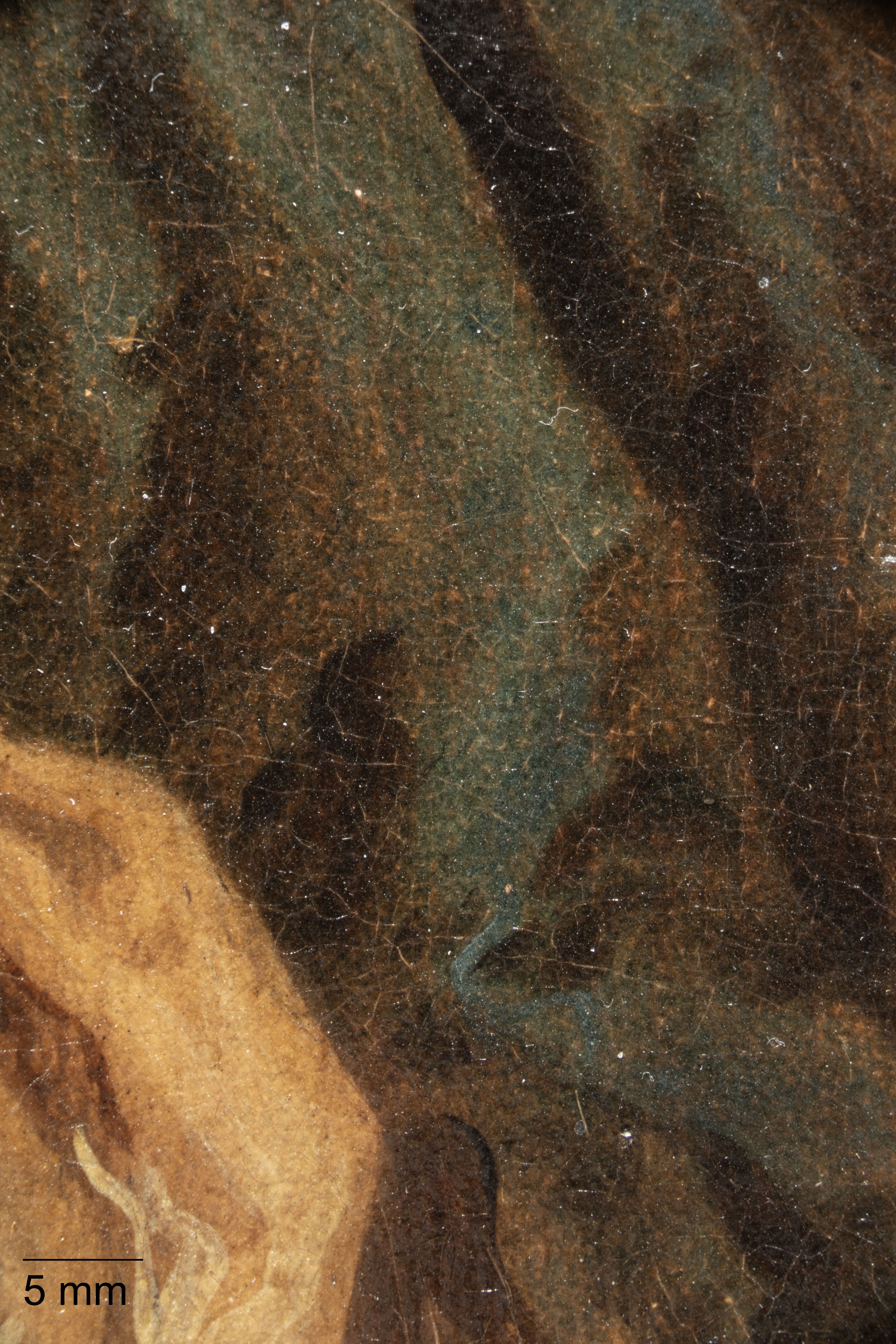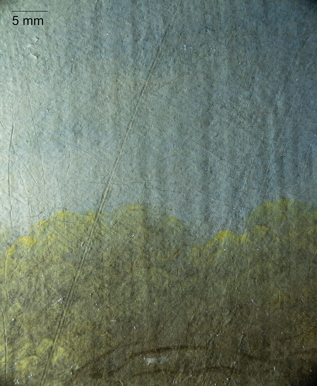 Fig. 31. Photomicrograph of the center-right woman’s blue skirt, showing the thin gray-brown wash, deeper black shadows, and green-blue highlights, The Bathers (1728–30)