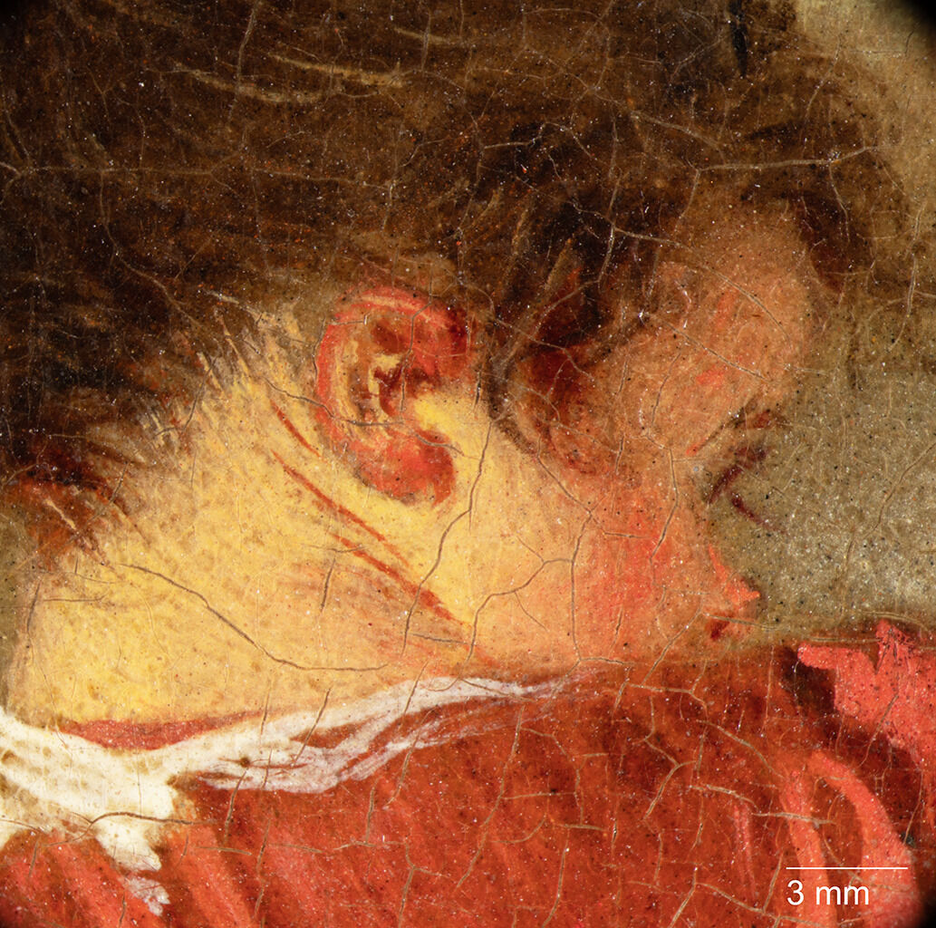 Fig. 32. Photomicrograph of the face of the central kneeling woman, illustrating the fine brushwork, The Bathers (1728–30)