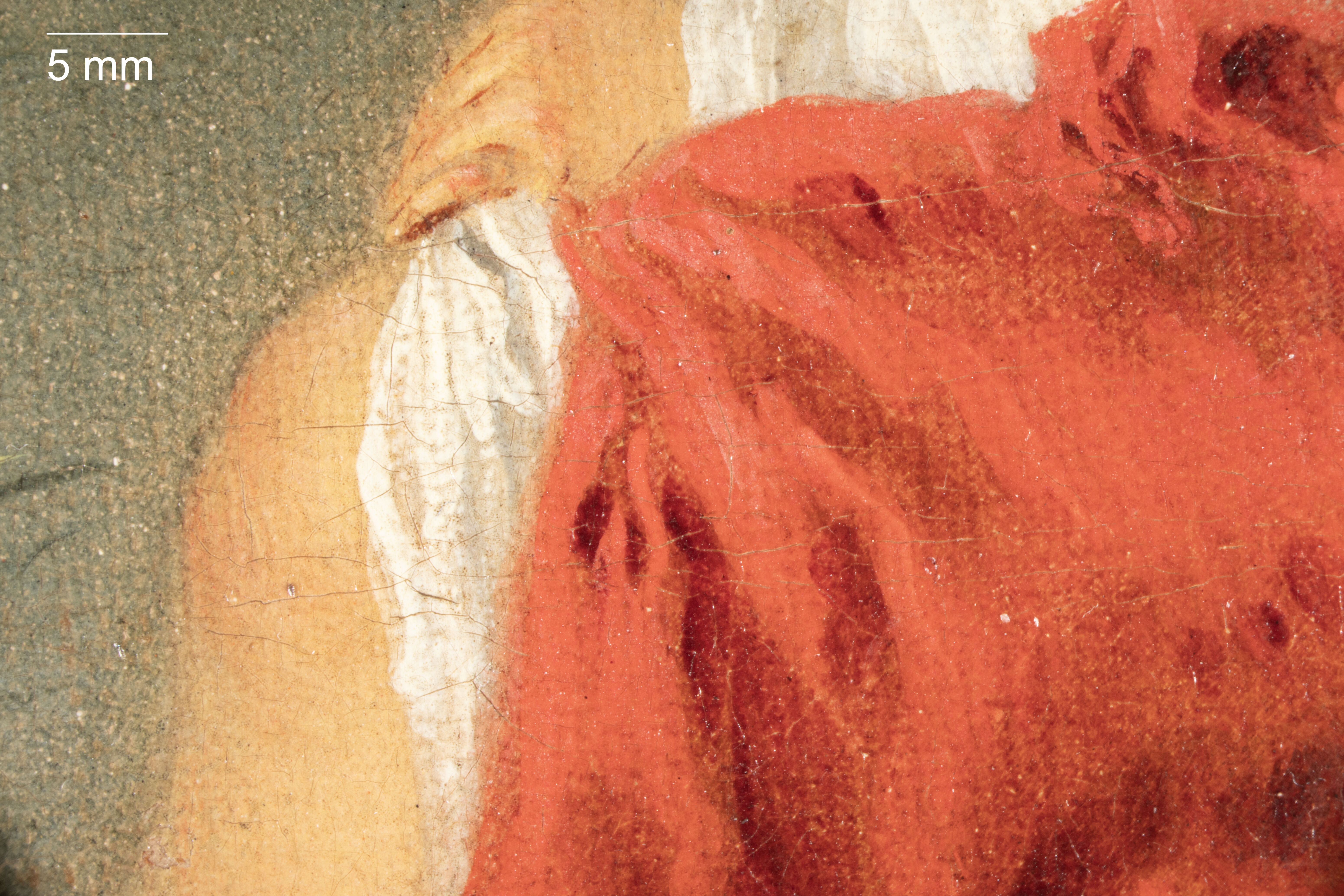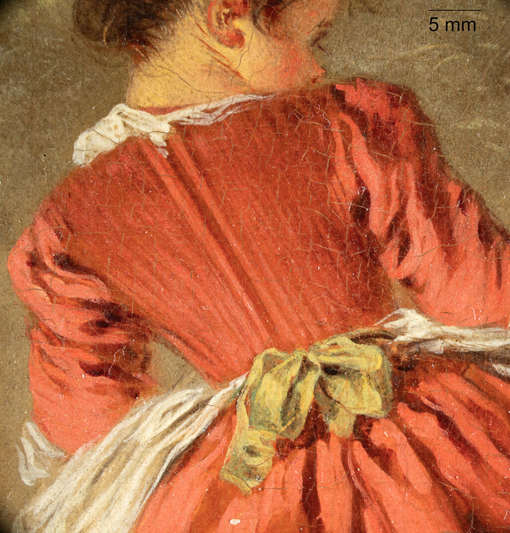 Fig. 30. Photomicrograph of the foreground woman’s red skirt, showing the thin red wash, deeper red shadows, and opaque red highlights, The Bathers (1728–30)