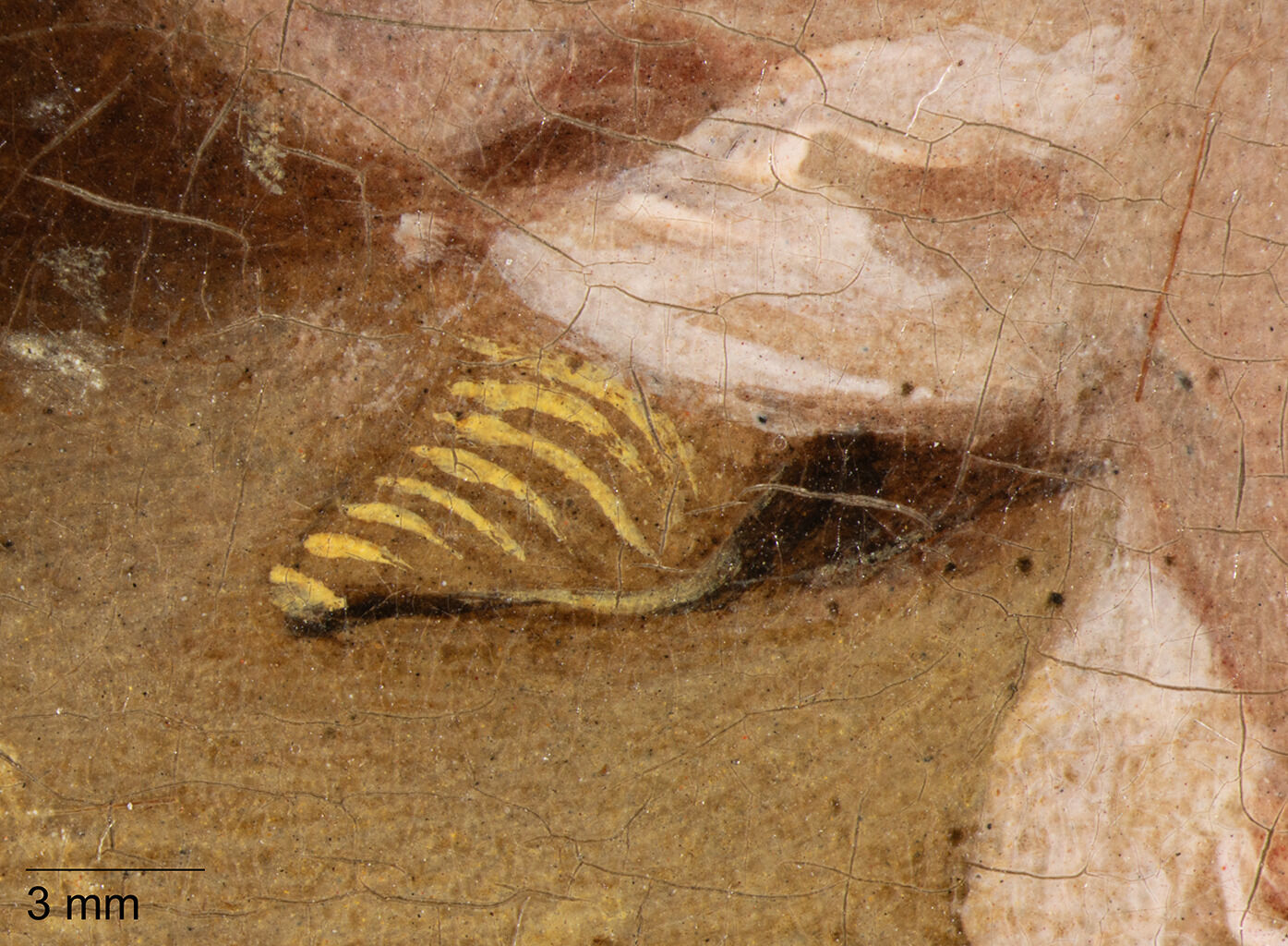 In contrast to the animated brushwork of the clothing, the figures’ heads were delicately painted with small brushes, sometimes producing lines as thin as one tenth of a millimeter. The features of the faces were formed with fine lines of brown and red paint, as is seen in the central kneeling figure (Fig. 32). Here the hair was constructed with short, thin brushstrokes, alternating highlights and shadows while allowing a lower brown wash to remain visible. Through the thinly painted hair, glimpses of underdrawing peek around the temple and ear, adding to the depth of the form.