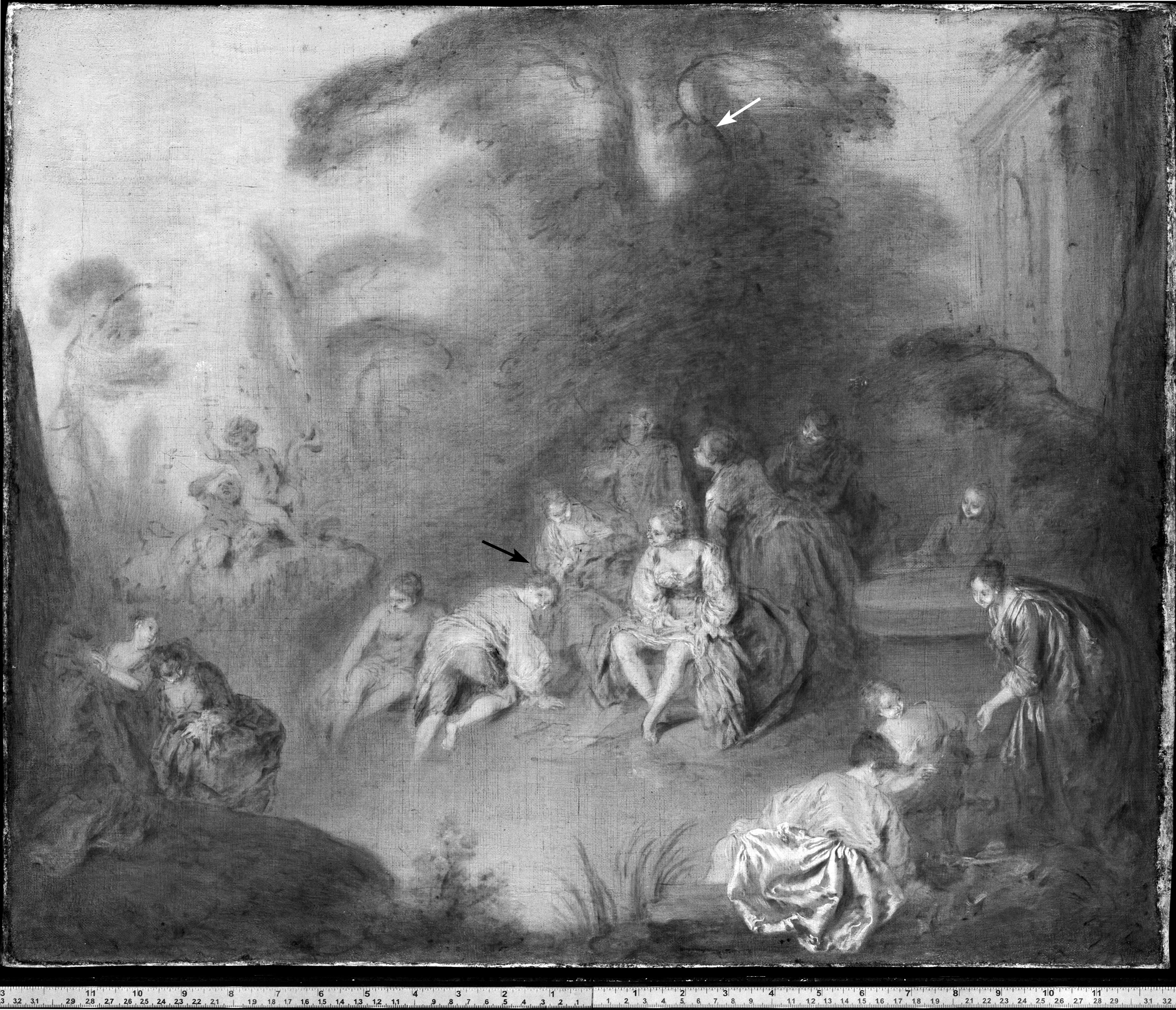Fig. 20. Infrared reflectograph captured at 1950 nanometers, with a white arrow indicating the fluid medium and a black arrow indicating the dry medium, The Bathers (1728–30)