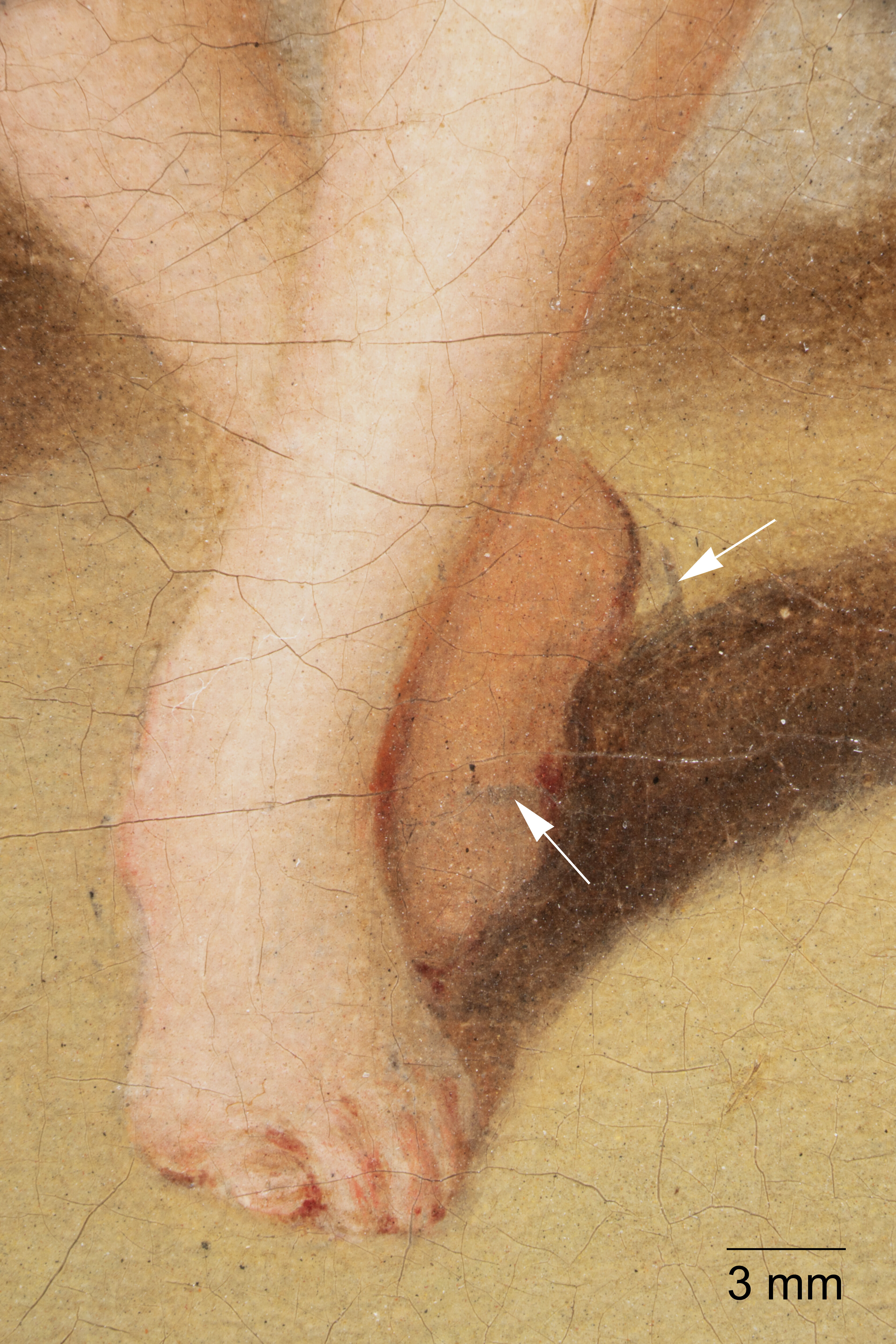Infrared reflectographyinfrared reflectography (IRR): A form of infrared imaging that exploits the behavior of painting materials at wavelengths beyond those accessible to infrared photography. These advantages sometimes include a continuing increase in the transparency of pigments beyond wavelengths accessible to infrared photography (i.e, beyond 1,000 nanometers), rendering underdrawing more clearly. The resulting image is called an infrared reflectogram. Devices that came into common use in the 1980s such as the infrared vidicon effectively revealed these features but suffered from lack of sharpness and uneven response. Vidicons continue to be used out to 2,200 nanometers but several newer pixelated detectors including indium gallium arsenide and indium antimonide array detectors offer improvements. All of these devices are optimally used with filters constraining their response to those parts of the infrared spectrum that reveal the most within the constraints of the palette used for a given painting. They can be used for transmitted light imaging as well as in reflection. reveals that two methods were used when developing the underlying drawing. Within the background, both the trees and the tall arch were sketched using a fluid medium, likely applied by brush based on the variation of line thickness. In contrast, the drawing of the figures and much of the foreground was formed with fine lines of a dry medium such as charcoal (Fig. 20). Throughout the painting, due to the thin application of paint, some of these fine lines remain visible in standard light, such as around the central figure’s feet (Fig. 21).