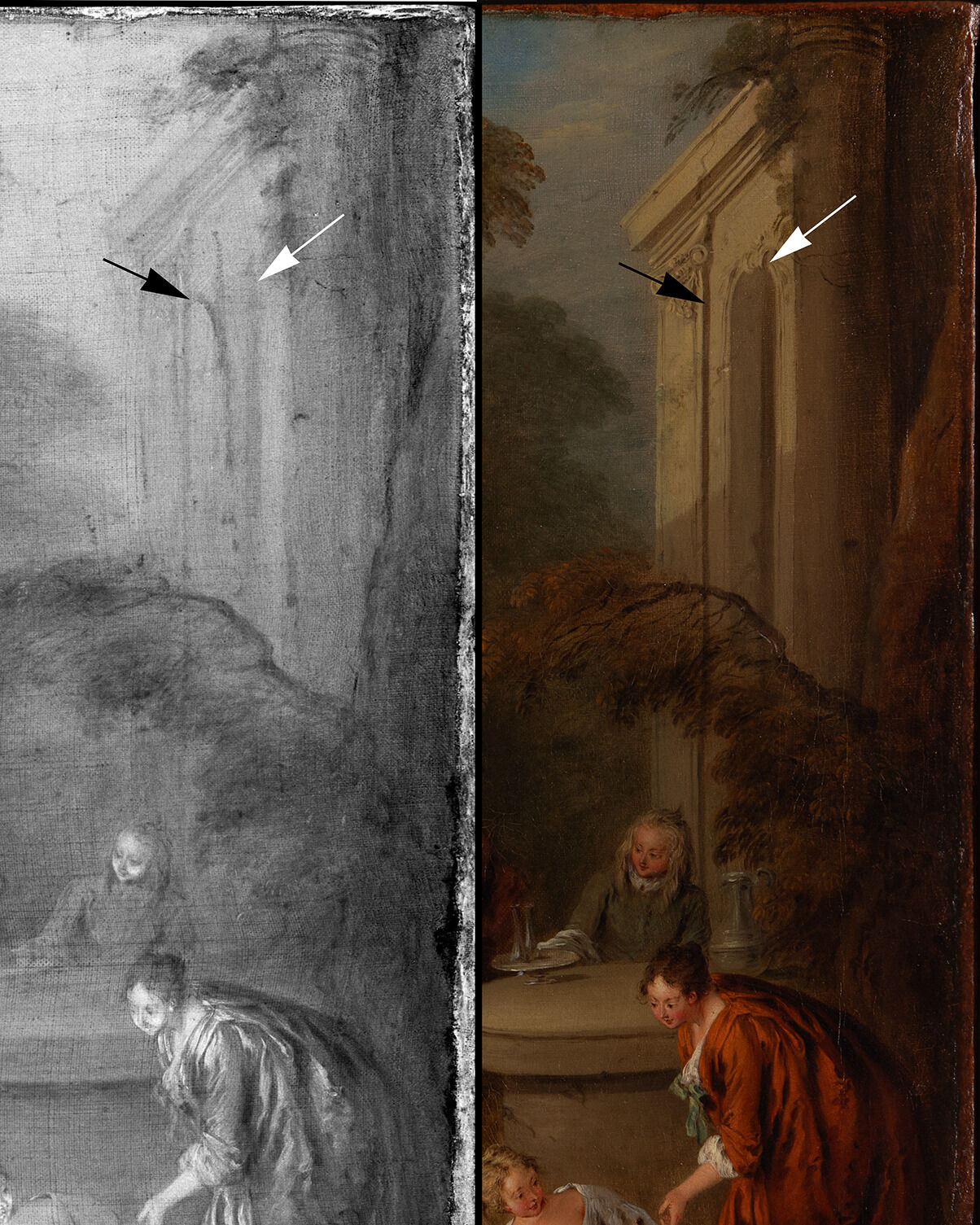 Fig. 22. Detail of arch in the infrared reflectogram, captured at 1950 nanometers (left) and in standard light (right), illustrating the changed position, with the black arrows indicating the original drawn placement and the white arrows indicating the final painted placement, The Bathers (1728–30)