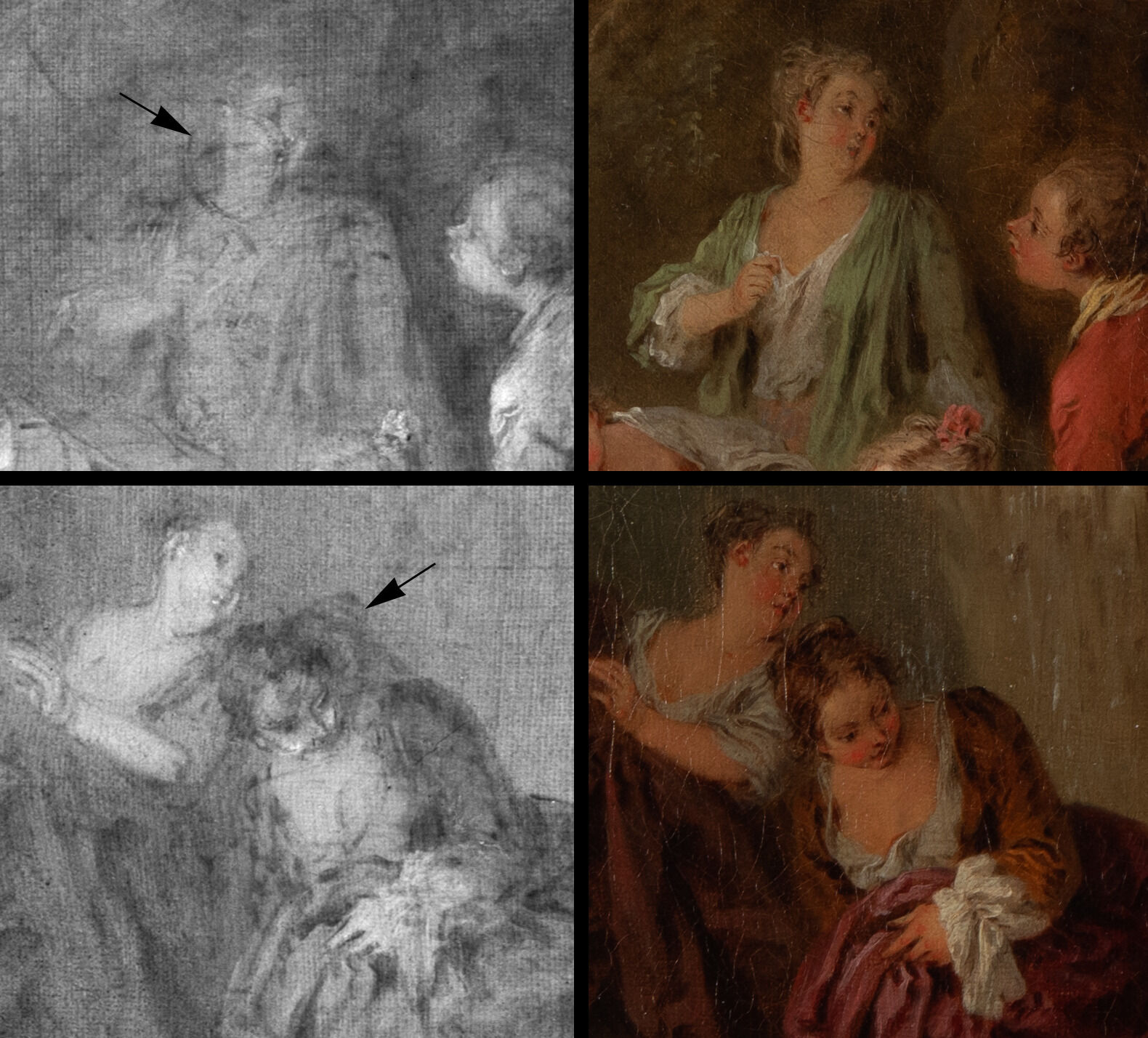 Fig. 23. Details of figures in the infrared reflectogram, captured at 1950 nanometers (left) and in standard light (right), illustrating the changed positions of heads, with arrows indicating the original drawn placements, The Bathers (1728–30)