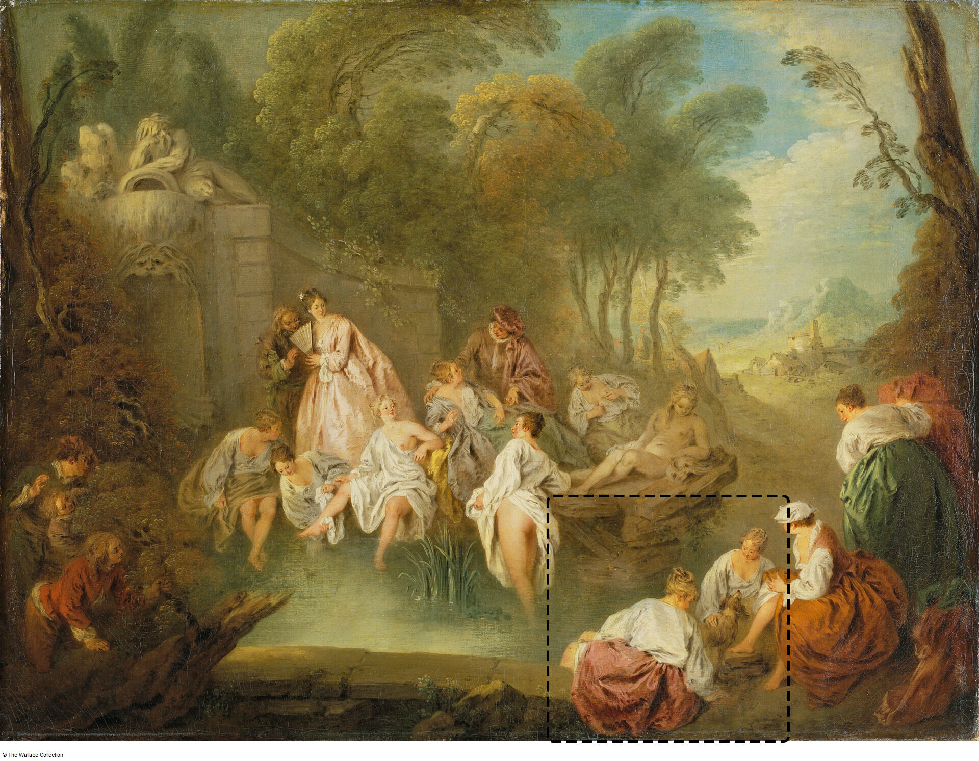 Fig. 25. Jean-Baptiste Pater, Bathing Party in a Park, ca. 1730, oil on canvas, 25 1/4 x 33 7/16 in. (64.2 x 85 cm), The Wallace Collection, London, P426. Creative Commons CC-BY-NC-ND 4.0. The dotted lines surround a group of figures which is simliar to that in The Bathers in the Nelson-Atkins collection.