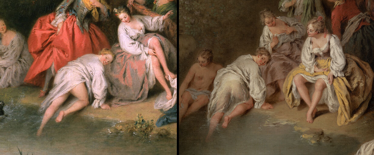 Fig. 26. Comparison of the foreground woman in Bathing Party in a Park (left; The Wallace Collection, London; ca. 1730) and of the foreground woman in The Bathers (right; the Nelson-Atkins; 1728–30)