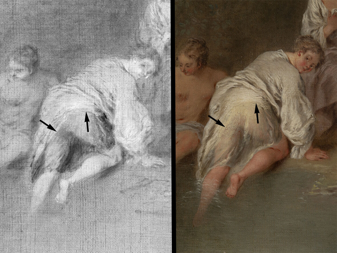 Fig. 29. Detail of central kneeling figure in the infrared reflectogram, captured at 1950 nanometers (left) and in standard light (right), revealing overpaint, with the black arrows indicating where the original paint likely ended, The Bathers (1728–30)