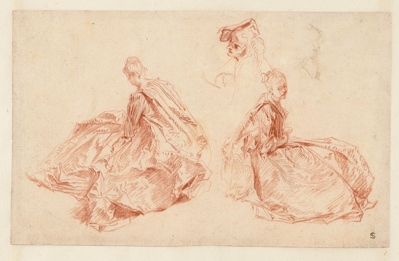 Pater’s link to this ornamental tradition was more than incidental. Like Watteau, Pater also worked in Audran’s workshop, supplying both arabesque decoration and figure designs.9Pullins, Mobile Image, 51, 56. The younger artist absorbed a visual system in which motifs could migrate fluidly between fine and decorative arts, as seen in a recto/verso drawing featuring a design for a RococoRococo: Developed under the reign of Louis XV (r. 1715–74) and his mistress the Marquise de Pompadour (1721–64), the Rococo style featured sensual, pastoral, and mythological subjects set in silvery light and created in painterly, soft colors. The works of François Boucher epitomize the style that spread to every medium, including furniture and decorative arts. wall with a fountain, swans, and a male figure holding a staff (Fig. 3). Like Watteau, Pater used red chalk for his preparatory drawings, which often contained multiple figure types or ornamental elements awaiting placement: to be inserted, recombined, or altered as needed for a commission. David Pullins has argued that this modular approach allowed artists to build up or break down their compositions with ease.10Pullins, Mobile Image, 99. Figure studies functioned as visual currency—reentering compositions in different guises, whether destined for a decorative panel, a cabinet picture, or an easel painting. In the case of The Garden Party, for instance, a drawing of two women seen from complementary vantage points (Fig. 4) finds visual echoes in the seated young girls facing opposite directions, underscoring the mobility and reuse of figural templates in Pater’s repertoire.11There is no definitive catalogue raisonnée of Pater’s drawings.