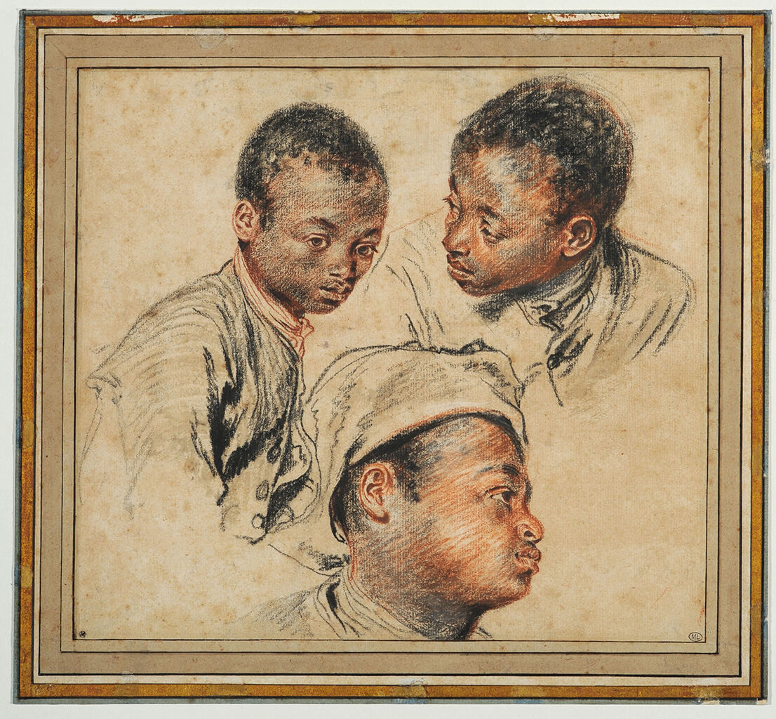Fig. 5. Jean-Antoine Watteau, Three Studies of a Young Black Man, ca. 1717, black, red, and white chalk and wash, 9 5/8 x 10 5/8 in. (24.3 x 27 cm), Musée du Louvre, inv. no. RF 28721, Recto. Photo: Suzanne Nagy. © Musée du Louvre, Dist. RMN-Grand Palais / Suzanne Nagy / Art Resource, NY