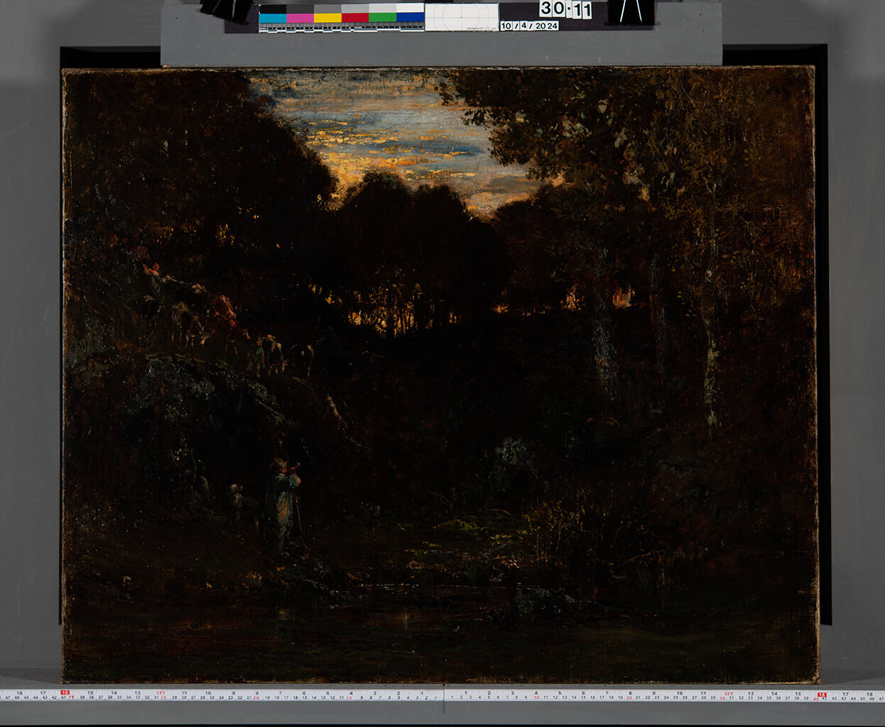 Within forty years after its completion, the Mesdag’s Salon painting (Fig. 3) suffered a ruinous transformation, as Rousseau’s medium-rich layers darkened, and wide fissuring (traction crackingtraction cracks: Also known as drying cracks, these are formed as the paint dries. They are usually the result of a “lean” paint with a small percentage of oil drying faster than an underlying “fat” paint layer with a higher percentage of oil. The quick drying of the top layer causes the paint layer to shrink and crack.) deformed the paint film.2Alfred Sensier, Souvenirs sur Théodore Rousseau (Paris: Leon Techener, 1872), 77–78. Although the Nelson-Atkins painting is also dark in appearance and somewhat illegible, it lacks the severe traction cracking of the Salon painting. A photograph of the Nelson-Atkins painting without exposure adjustment conveys its darkened appearance and the difficulty viewing its terrain (Fig. 6).