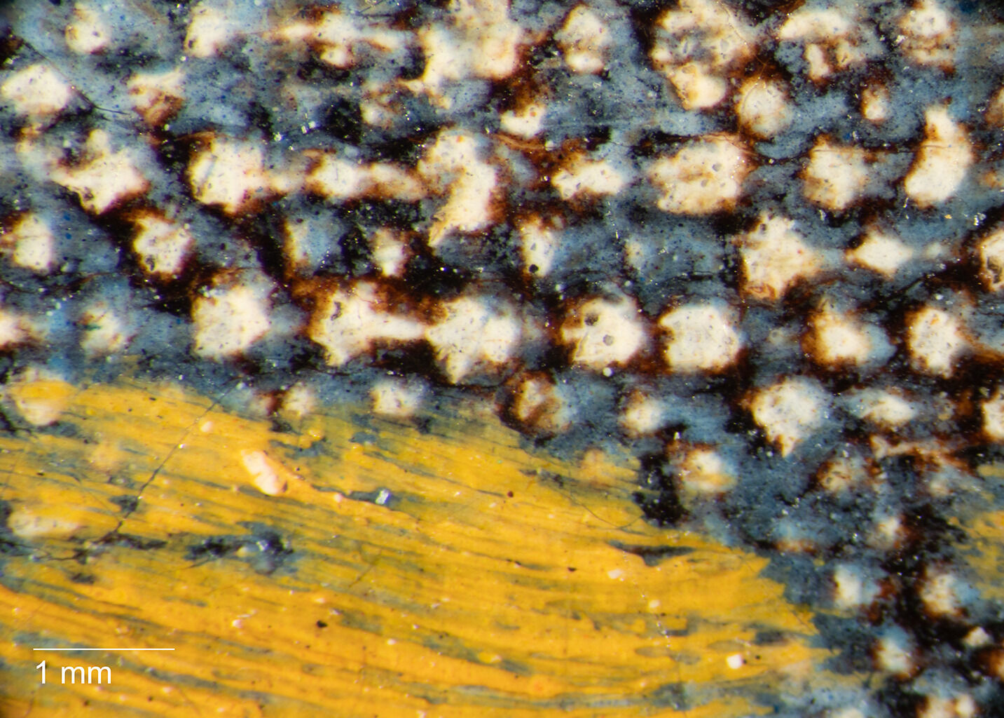 Fig. 9. Photomicrograph of the lower right foreground of The Eagle’s Nest, Forest of Fontainebleau (ca. 1837–67), revealing underlying blue paint