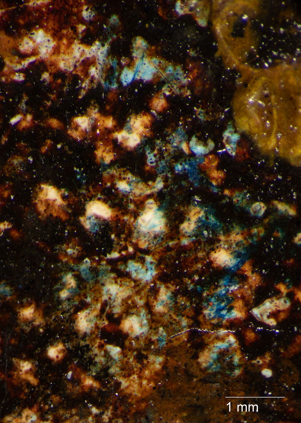 Fig. 10. Photomicrograph of The Eagle’s Nest, Forest of Fontainebleau (ca. 1837–67), showing bright blue paint beneath the reddish-brown tinting layer