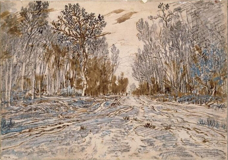 Fig. 11. Théodore Rousseau, The King’s Causeway, in the Forest of Fontainebleau, ca. 1850, charcoal, brown and gray wash, and watercolor highlights on paper, 7 7/8 x 11 3/16 in. (20 x 28.4 cm), Musée du Louvre, Paris, RF 23339. Photo: © RMN, Musée du Louvre / Jean-Gilles Berizzi