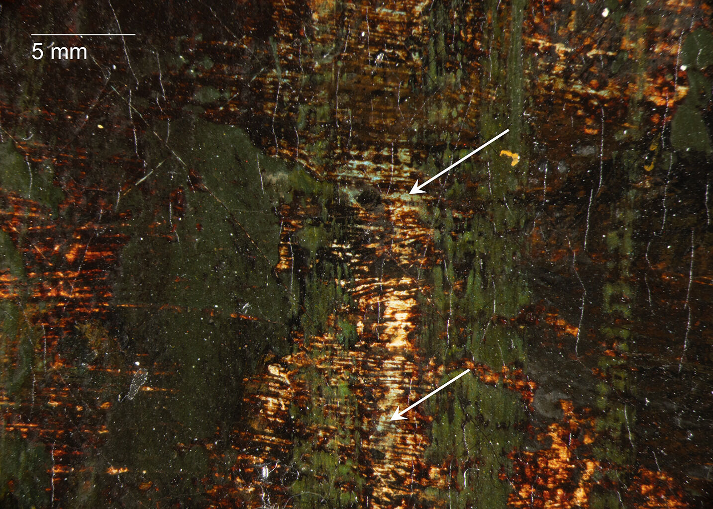 Comparisons with this prior research confirmed many palette similarities to the Nelson-Atkins painting. However, the absence of traction cracking or distortions combined with the results of our pigment analyses suggest that bitumen was not used. Emerald green was used prominently along with viridian to depict green foliage in this painting. Analysis shows that there are some instances of the presence of arsenic disassociated from copper that could be evidence of the release and migration of this element from emerald green. However, at the particulate level, there were no darkened alteration products found to have a clear association with this unstable pigment.