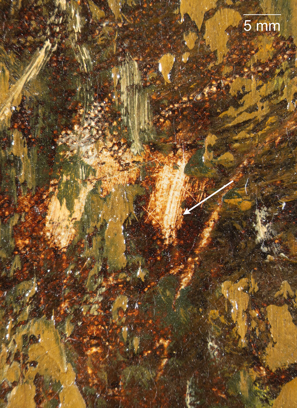 Fig. 13. Photomicrograph of The Eagle’s Nest, Forest of Fontainebleau (ca. 1837–67), revealing an area of reddish-brown paint that was removed by the artist’s dry brush