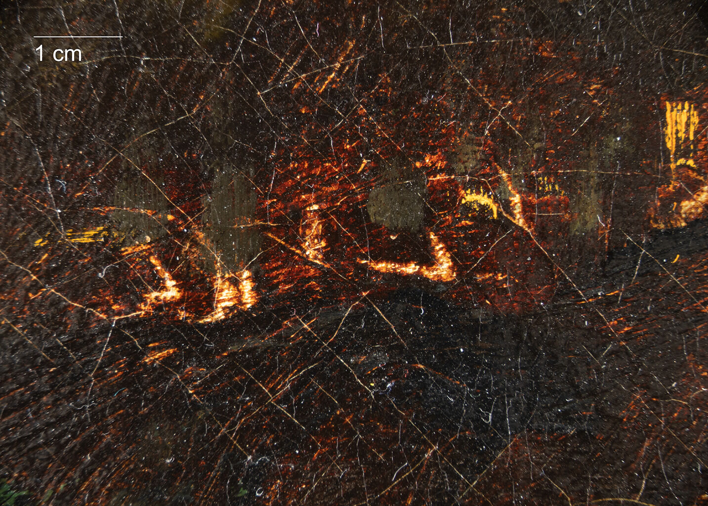In spite of the landscape’s dark and murky palette, subtle color variations are present amid the semitransparent brown paint of the trees. Figure 12 shows one such detail in which deep ultramarine blue is visible. The trees and foreground were rendered from dark to light with painterly brushwork, palette knife applications, and, at times, a subtractive painting method. An example of the latter is apparent on the upper right, where Rousseau removed paint with a dry brush to reveal the ground and gray paint, creating a small passage of sky (Fig. 13). With his palette knife, or an equivalent sharp tool, he scratched into the wet paint, loosely marking the lower right embankment and a few branches among the upper right trees. Again, using a subtractive method, several short angular marks were also made into the brown paint at the right horizon (Fig. 14) to portray the passage of light through the trees, while a similar effect on the horizon was achieved with additions of thick yellow impastoimpasto: A thick application of paint, often creating texture such as peaks and ridges..