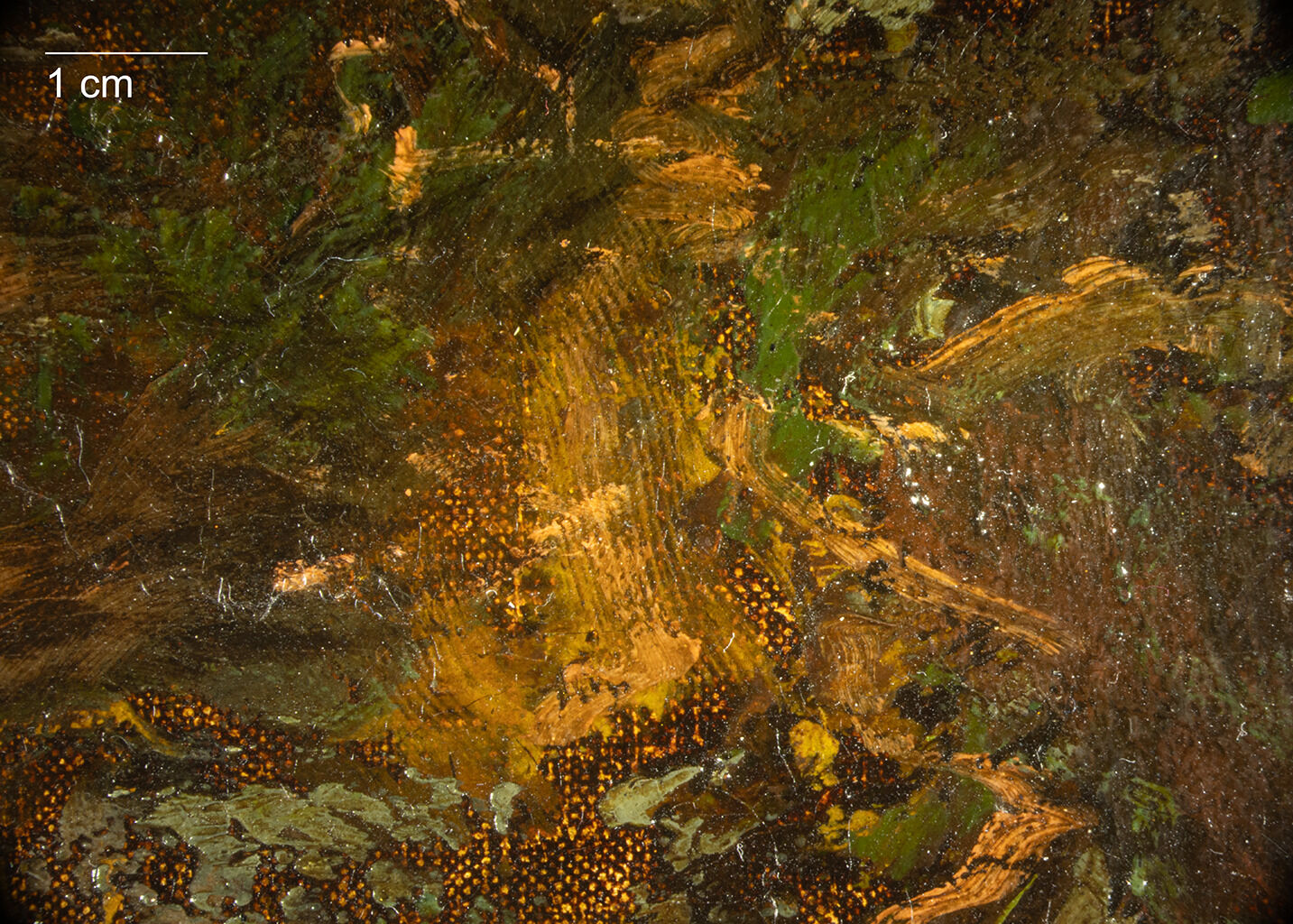 The former connections between the dark landscape of The Eagle’s Nest (Fig. 6) and the 1830’s Jura landscapes, in particular the rapid darkening and deterioration of the Salon painting (Fig. 3), raised questions about how the Nelson-Atkins painting might have changed over time. Prior investigations of the Mesdag and Amiens paintings focused on a variety of phenomena leading to discoloration. Writers in the late nineteenth century attributed this type of darkening and distortions of the paint layers to bitumen, a form of natural petroleum tar that imparts a warm brown to oil paint, but which is very detrimental to its drying and subsequent stability. For these reasons, bitumen is usually accompanied by severe, disfiguring traction cracking, sometimes referred to as alligatoring or alligator skin.