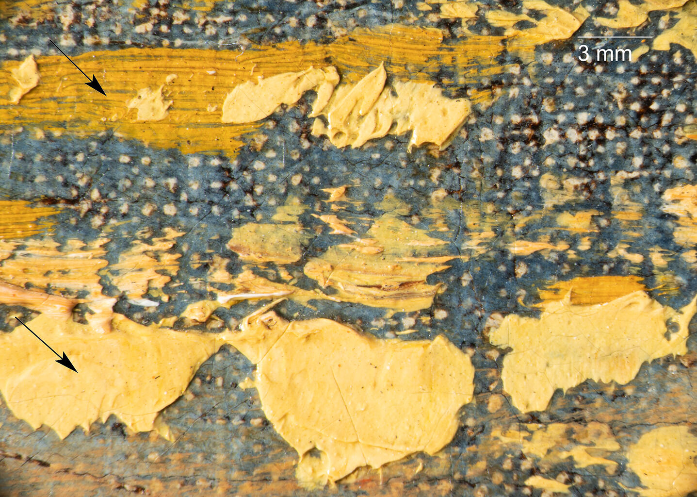 Fig. 16. Thick yellow and orange paint in the lower sky of The Eagle’s Nest, Forest of Fontainebleau (ca. 1837–67), applied by both brush (top arrow) and palette knife (bottom arrow)