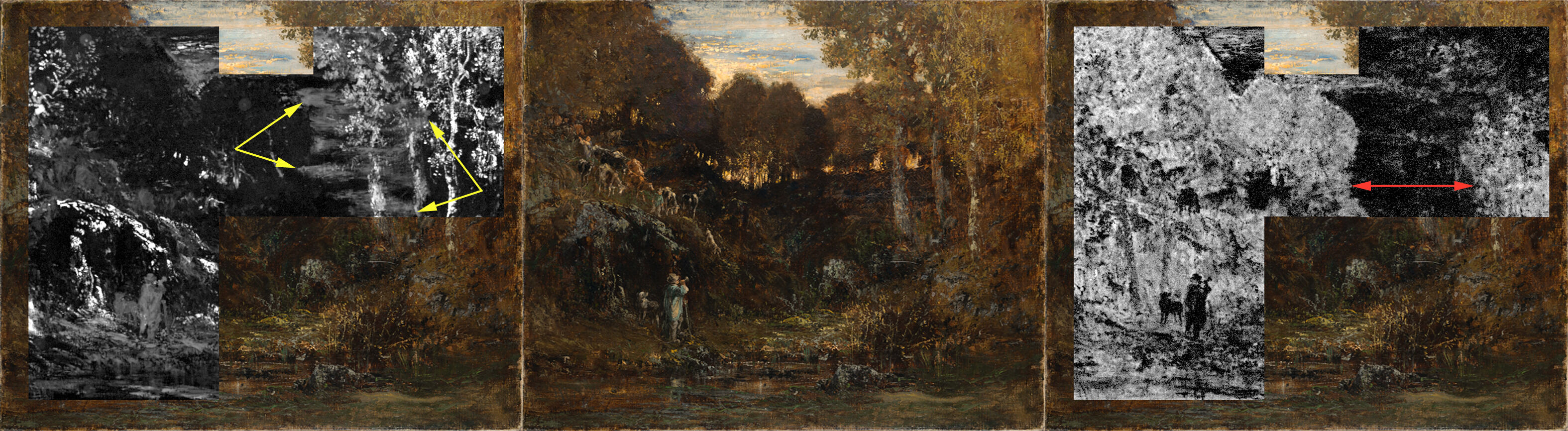 While the foregoing identifications of individual pigments required microanalysis of samples, the integration of this information in relation to Rousseau’s methods and compositional changes required the use of non-sampling instrumental methods to disclose how these materials were distributed in the composition. These results have also been applied to questions about the painting’s execution date and how much time may have passed before the forest scene was transformed into the current composition.