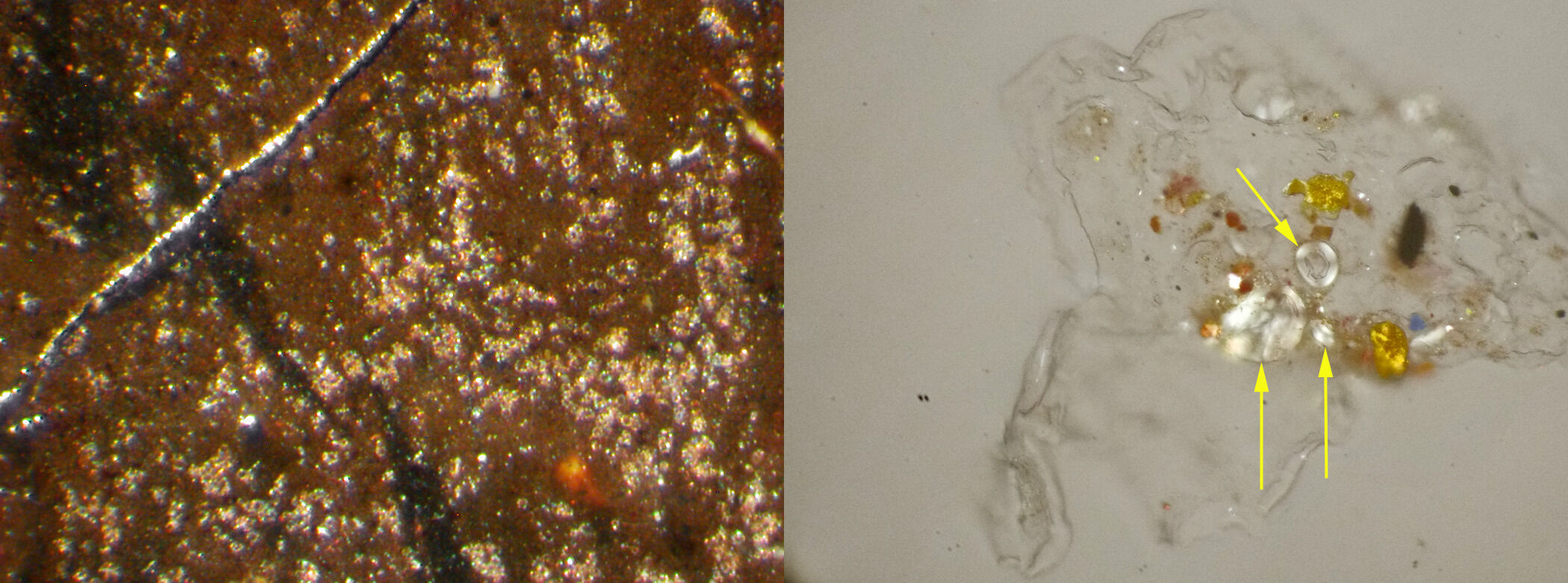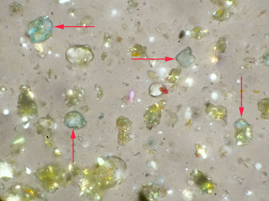 PLM revealed that starch was an additive for a tin-based deep red lake that was used for the ébauche (Fig. 20). Occasional instances of bright yellow seen in PLM that are not associated with well-defined particles indicate some use of a yellow lake. The most subtle distinction found in PLM, and one that could not be resolved by other techniques, involved the discovery of “mineral blue,” a pigment of widely varying composition based on the application of a blue organic color or dye to a colorless, inorganic substrate, such as white clay (Fig. 21). This most often involved Prussian blue, the saturation of which allowed it to be greatly diluted on a colorless filler while retaining a strong tinting capacity. Interestingly, in 1872, Rousseau’s biographer, Alfred Sensier, noted that Rousseau rarely used mineral blue, and his use of Prussian blue was even less frequent.21Sensier, Souvenirs sur Théodore Rousseau, 201.