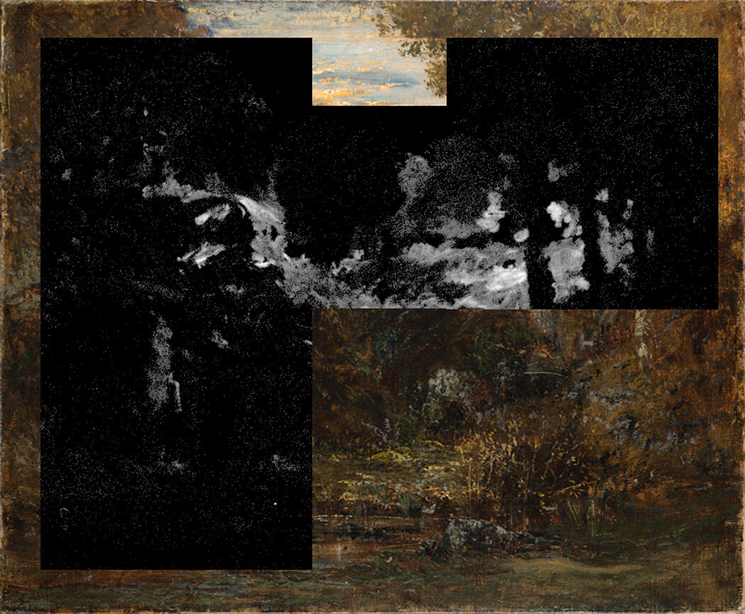 Recent technical analysis has highlighted Rousseau’s rugged, anti-academic technique. He used a palette knife across much of the canvas surface to evoke the materiality of natural textures.11See Mary Schafer and John Twilley’s accompanying technical entry. His dragged paint suggests the mottled texture of tree bark and evokes the surface of the water. The luminous sunset sky is also rendered with the flattened marks of the palette knife. Gustave Courbet (1819–77) is probably best known for this technique, but Rousseau also used it on occasion, as, for example, in the Charcoal-Burner’s Hut (ca. 1850–51; Musée du Louvre, Paris). Nevertheless, it is unusual in his oeuvre. His experimental approach is also evident here in his scraping away of paintsgraffito (pl: sgraffiti): An Italian term meaning “scratched,” in which a compositional design or decoration is created using a sharp tool to scrape into the wet medium (paint, plaster, glaze, slip, etc) and reveal contrasting underlying layers., probably using the butt end of the brush, as in the areas of foliage to the right.12Schafer and Twilley, technical entry. Technical analysis has indicated that Rousseau revised this picture considerably. Originally the horizon line descended to the right of the composition, offering what would have been a much more open vista on the right of the picture. Rousseau later added the mass of three trees to the right, creating a more closed and claustrophobic composition. The precise timeline for Rousseau’s reworking of this picture remains unclear, but it was not uncommon for him to revise his paintings over a number of years. The picture was probably begun during the late 1830s during Rousseau’s period of intense study in the forest, when he favored a dark palette and rugged impastoimpasto: A thick application of paint, often creating texture such as peaks and ridges. technique. New research from conservator Mary Schafer and science advisor John Twilley indicates that the later paint layer (with the three-tree addition) contains zinc chromate yellow and cadmium yellow, both of which seem to have been only commercially available from the mid-1840s.13Schafer and Twilley, technical entry. The presence of these pigments suggests that Rousseau revised the picture after this latter date, perhaps even as late as the end of his career.14This dating contrasts with the date of 1860–65 in the Rousseau catalogue raisonné: Michel Schulman, Théodore Rousseau, 1812–1867: Catalogue Raisonné de l’Oeuvre Peint (Paris: Éditions de l’Amateur, 1999), no. 642, p. 326. Rousseau’s paint application in this picture, however, is very different from the uniform, “proto-pointillist” brushwork characteristic of his newly produced work of the early 1860s. In fact, he likely sold the picture to the dealers Paul Durand-Ruel (1831–1922) and Hector Brame (1831–99) in the summer of 1867 (see provenance information below).