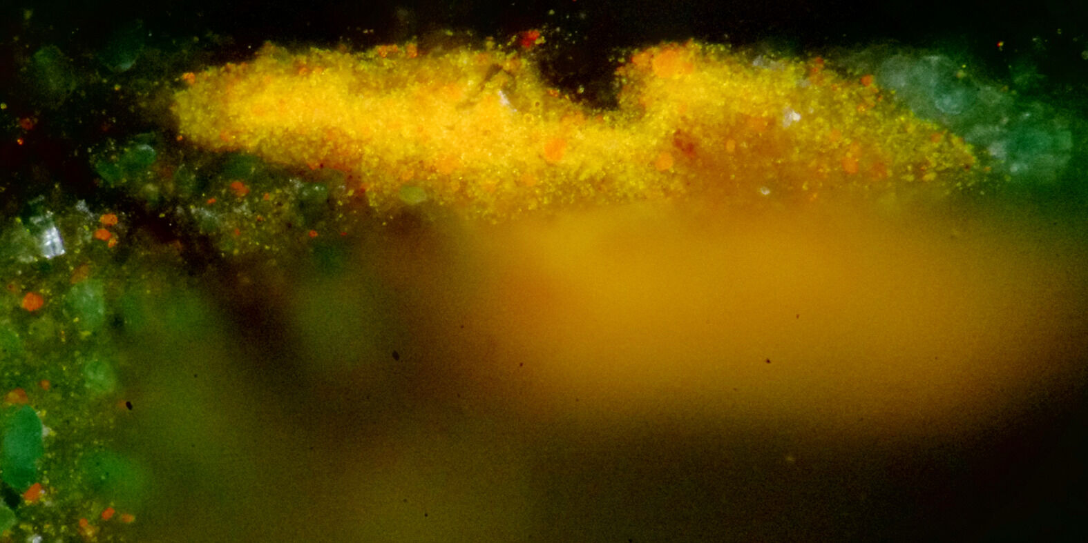 Fig. 26. Cross section detail of a paint sample from leaves along the right edge of The Eagle’s Nest, Forest of Fontainebleau (ca. 1837–67), showing bright emerald green and cadmium yellow pigments in immediate contact with one another yet lacking any obvious blackening from their interaction. Brightfield reflected light with crossed polars, 500x nominal.