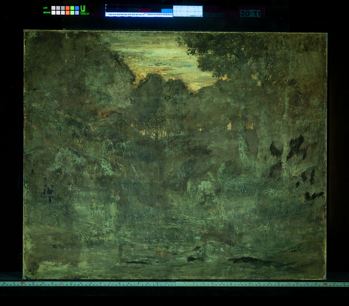The landscape was last treated in 1969, at which time the painting was cleaned, a canvas patch was removed, and the canvas was wax-lined. The former stretcherstretcher: A wooden structure to which the painting’s canvas is attached. Unlike strainers, stretchers can be expanded slightly at the joints to improve canvas tension and avoid sagging due to humidity changes or aging., a six-member support with two intersecting crossbars, was replaced with a modern stretcher (Fig. 7).42James Roth, June 15, 1969, examination report, NAMA conservation file, 30-11: “Stretcher: butt-end corners, (2) cross-bars, wood keys. Corners are over-extended and weak.” A small tear, located on the lower left, was stabilized by the lining. The painting exhibits differing levels of UV-induced visible fluorescenceultraviolet (UV) fluorescence or UV-induced visible fluorescence: The reflected visible light produced when painting materials interact with ultraviolet (UV) radiation. Not all materials fluoresce, but the color and intensity of the fluorescence is frequently used to differentiate between original and restoration materials, characterize the varnish layers, or reveal the distribution of pigments across the composition., as if the painting was selectively cleaned in the past (Fig. 27). While there are clear areas of non-fluorescing material that correspond to recent retouchingretouching: Paint application by a conservator or restorer to cover losses and unify the original composition. Retouching is an aspect of conservation treatment that is aesthetic in nature and that differs from more limited procedures undertaken solely to stabilize original material. Sometimes referred to as inpainting or retouch., it is possible that there are other paint strokes beneath the varnish that were added during past treatment.