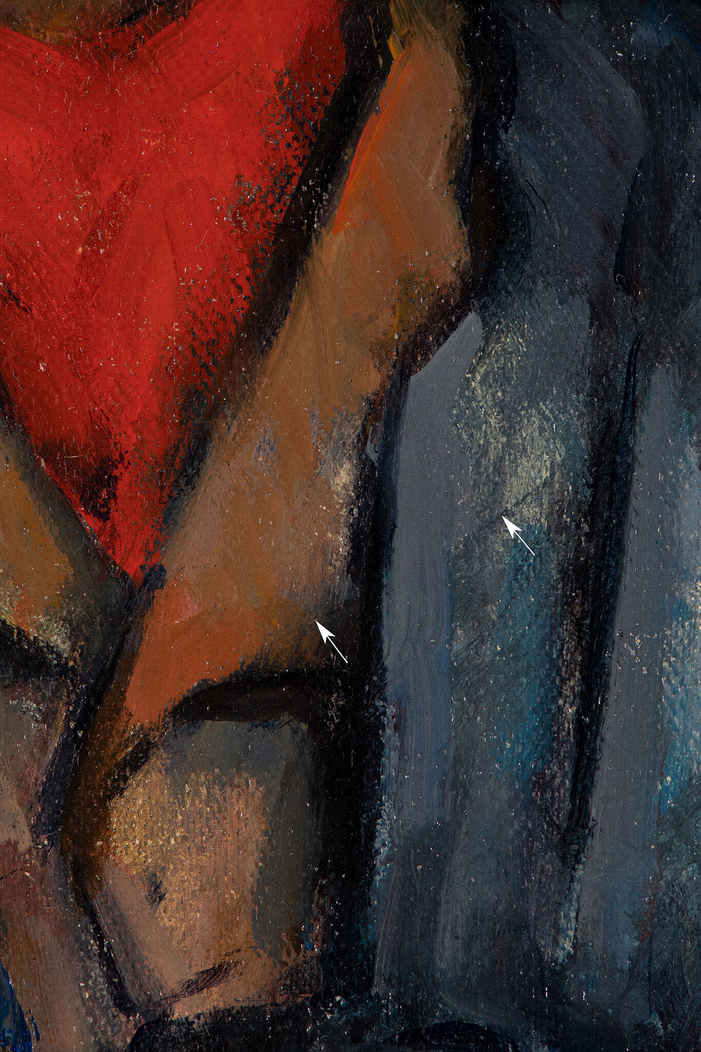 Fig. 7. Detail of the lapel with arrows pointing to a possible underdrawing beneath the coat, Man with a Pipe (1890–92)