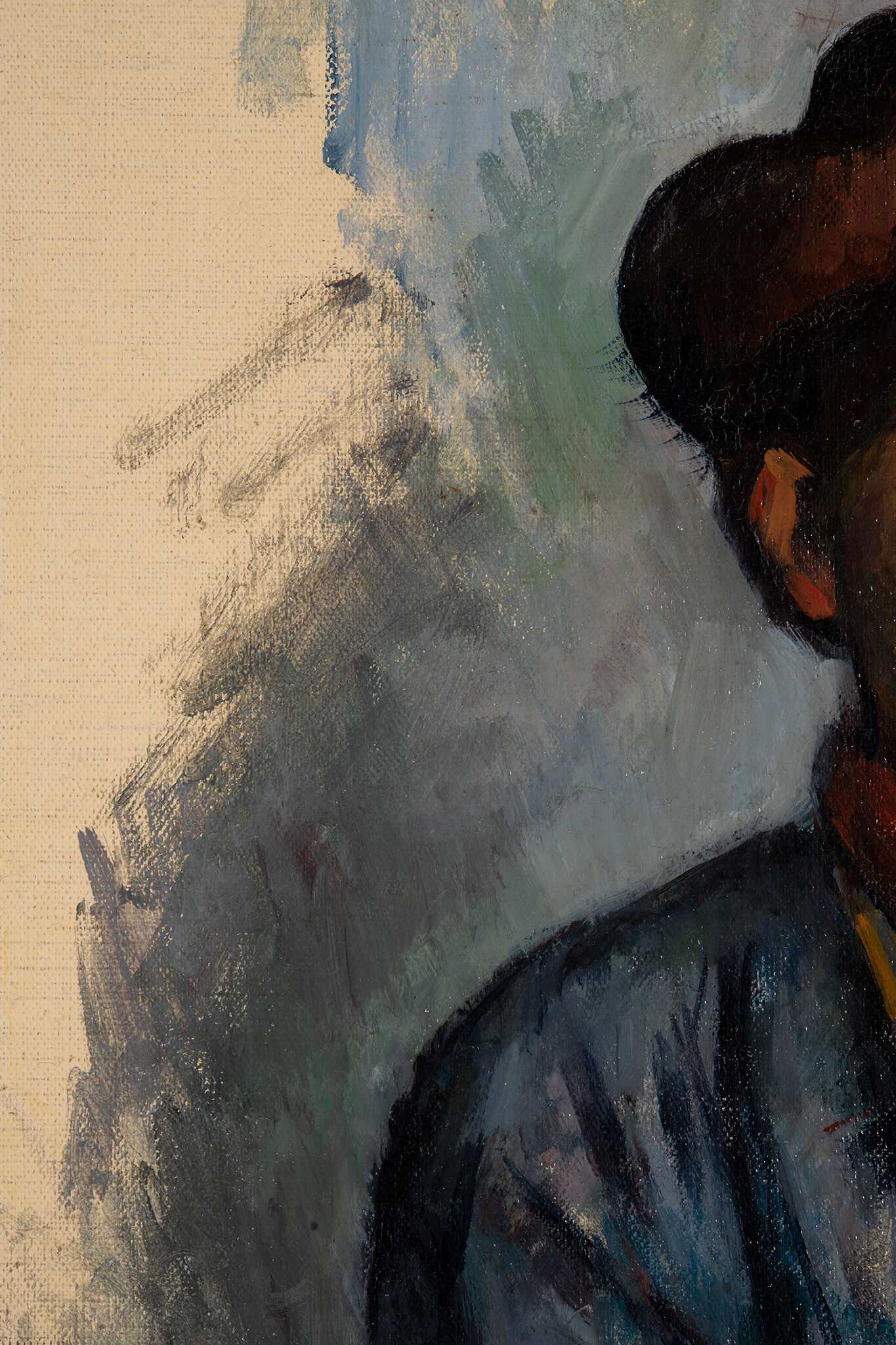 Man with a Pipe was painted as part of a series of studies in preparation for Paul Cezanne’s Card Players paintings (Figs. 1, 2). Executed on plain-weaveplain weave: A basic textile weave in which one weft thread alternates over and under the warp threads. Often this structure consists of one thread in each direction, but threads can be doubled (basket weave) or tripled to create more complex plain weave. Plain weave is sometimes called tabby weave. canvas, the original dimensions of the painting are unknown, as the tacking marginstacking margins: The outer edges of canvas that wrap around and are attached to the stretcher or strainer with tacks or staples. See also tacking edge. were removed, and the painting was resized during a lininglining: A procedure used to reinforce a weakened canvas that involves adhering a second fabric support using adhesive, most often a glue-paste mixture, wax, or synthetic adhesive. process predating its history at the Nelson-Atkins Museum of Art. Early publications erroneously list this painting as being 39 by 30 centimeters (15 3/8 by 11 13/16 inches), although these dimensions would have noticeably cropped the image.1The erroneous dimensions were first published in Lionello Venturi, Cézanne: Son art, son œuvre (Paris: Paul Rosenberg, 1936), no. 563, pp. 1:186–87. Additionally, there are no cracks or creases that would verify this size.