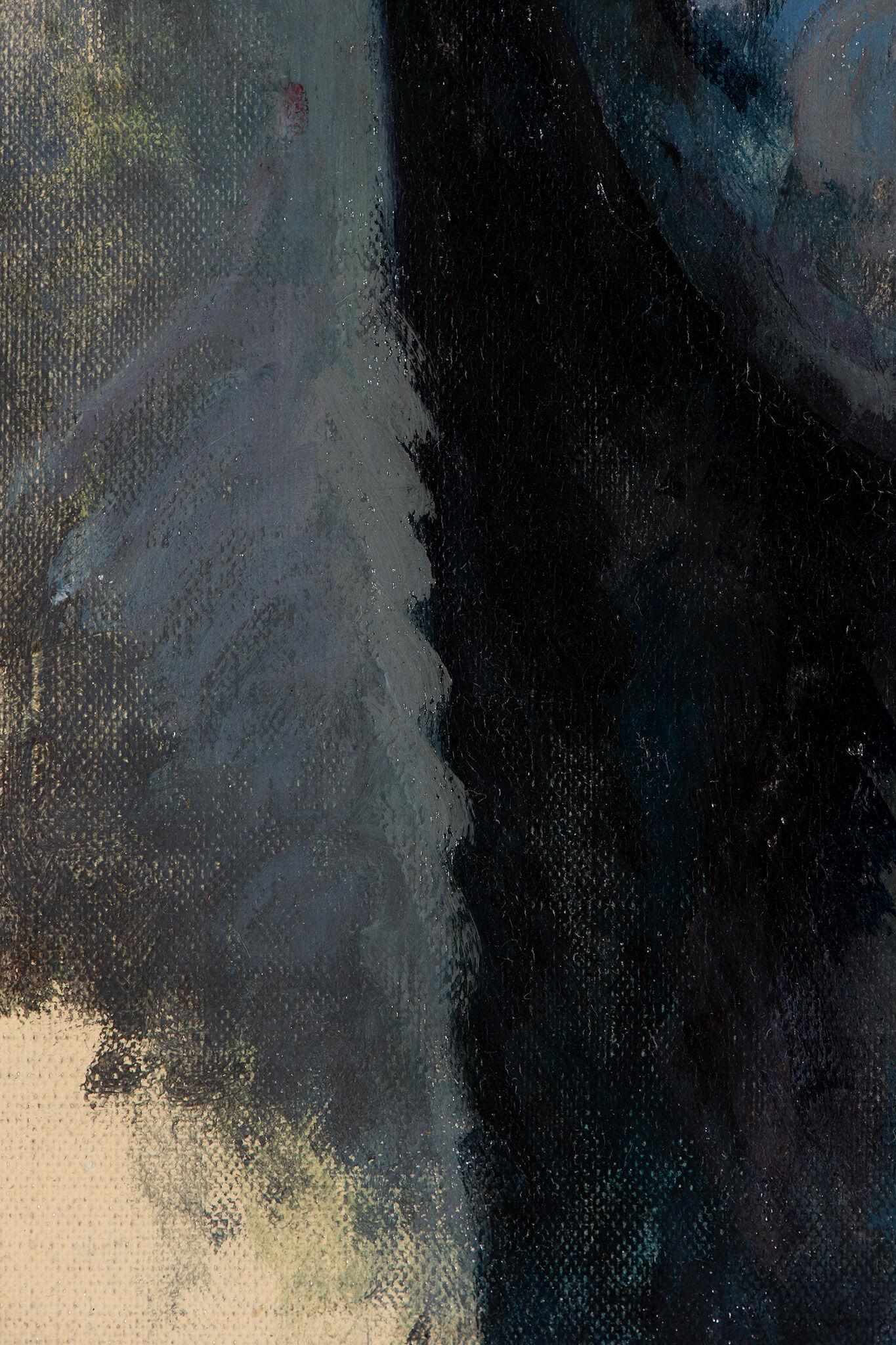 The painting is in overall good condition. The current glue-paste lining was completed prior to the painting’s acquisition at the Nelson-Atkins. In 1993, the painting was cleaned, and inpainting was completed.11Scott Heffley, February 12, 1993, treatment report, NAMA conservation file, 2015.13.6. Based on examination with ultraviolet (UV) radiationultraviolet (UV) radiation: A segment of the electromagnetic spectrum, just beyond the sensitivity of the human eye, with wavelengths ranging from 100–400 nanometers. For a description of its use in the study of art objects, see ultraviolet (UV) fluorescence or UV-induced visible fluorescence., a moderate amount of retouchingretouching: Paint application by a conservator or restorer to cover losses and unify the original composition. Retouching is an aspect of conservation treatment that is aesthetic in nature and that differs from more limited procedures undertaken solely to stabilize original material. Sometimes referred to as inpainting or retouch. is present on the cream ground layer. Extensive retouching is present at a few millimeters along the top and bottom edges; however, these are extensions to the picture plane related to the lining process.