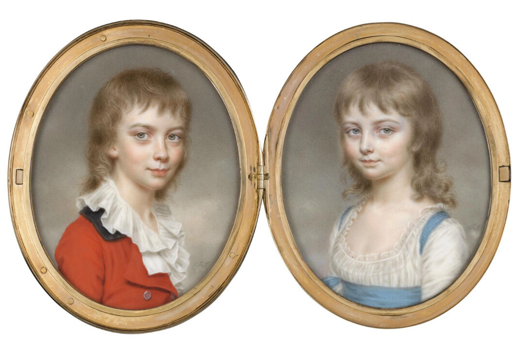 John Smart, Portraits of William and Maria Burroughs, ca. 1797, 2 5/8 x 2 1/16 in. (6.6 x 5.2 cm) each, sold at Sotheby’s, London, Important Miniatures from a Private Collection, April 16, 2008, lot 94, https://www.sothebys.com/en/auctions/ecatalogue/2008/important-miniatures-from-a-private-collection-l08172/lot.94.html; and John Smart, Portraits of Letitia and Louisa, 1797, 2 5/8 in. (6.6 cm) high each, sold at Christie’s, London, Miniatures and Objects of Vertu, October 26, 1949, lot 114. Louisa’s miniature has resurfaced at the Fondazione Centro Studi Sull’Arte, Lucca, Italy, no. 0007420, https://fototeca.fondazioneragghianti.it/scheda/F/70423.