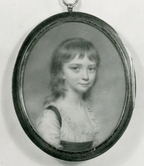 John Smart painted this portrait of a young girl in 1797, and while her identity remains unknown, she bears some resemblance to members of the Burroughs family. Smart completed drawings of Letitia Burroughs and her four children—William (1784–1814), Letitia (ca. 1786–1832), Louisa (1789–1862), and Maria (ca. 1790–1798)—along with finished works on ivory: The hard white substance originating from elephant, walrus, or narwhal tusks, often used as the support for portrait miniatures. of the children, which are dated 1797.1See Christie’s, London, Sketches and Studies for Miniature Portraits by John Smart, the Property of Mrs. Busteed, Great-Granddaughter of the Artist, December 17, 1936, lot 44: “A Frame, containing a collection of sixteen portraits in pencil, many signed and dated, including the Burroughs Family. . . .” The drawings’ whereabouts are currently unknown. It is unclear whether these portraits were dated.
